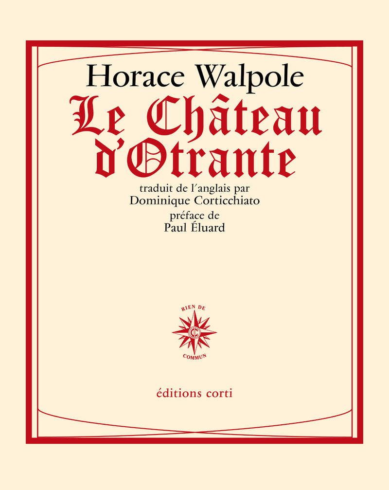 Annie LebrunDe ce texte, republié par José Corti, avec une préface de Paul Éluard, en 1943, et réédité aujourd’hui, Walpole disait qu’il ne l’avait pas écrit pour un XVIIIe siècle friand de « raison froide », mais pour plus tard. Comme s’il avait pressenti l’incroyable succès du roman gothique au début du XIXe siècle.